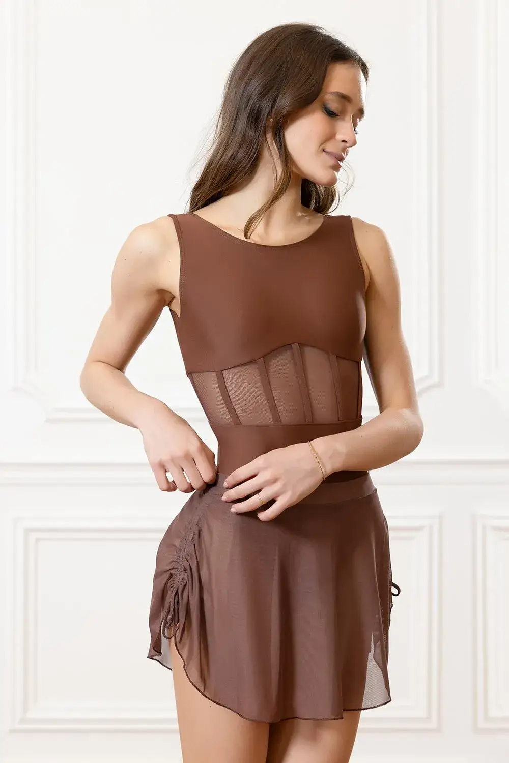 Os drapeados com rolotê nas laterais acrescentam charme e permitem um ajuste sutil, garantindo conforto, elegância e liberdade nos movimentos. Ideal para compor looks de dança com leveza e graciosidade.